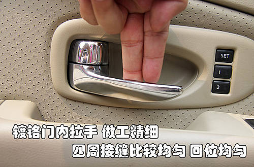 車門內(nèi)側(cè)拉手采用鍍鉻設(shè)計(jì),金屬感比較強(qiáng)烈。雖然拉手周圍由塑料制成,但是拉手周圍的做工都很精細(xì)。