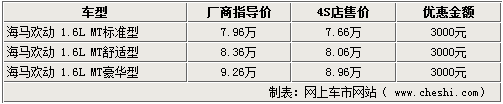 在市場(chǎng)中銷售有段時(shí)間的1.6L歡動(dòng)新車,現(xiàn)已進(jìn)入各個(gè)海馬經(jīng)銷商展廳,現(xiàn)車充足顏色齊全。在售的三款新車均為手動(dòng)版車型。除直接享受國(guó)家1.6L車型的購置稅優(yōu)惠政策外,并有現(xiàn)金3千元優(yōu)惠;銷售人員表示,現(xiàn)金優(yōu)惠也可換為等值的裝飾禮包,同樣超值。現(xiàn)金優(yōu)惠配合購置稅優(yōu)惠,則大大減輕了消費(fèi)者的購車負(fù)擔(dān)。