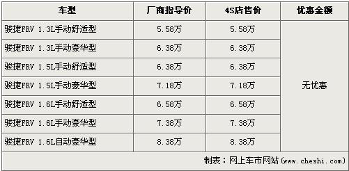 據(jù)經(jīng)銷商處銷售人員介紹,駿捷FRV在售車型已經(jīng)擴(kuò)大到了7款,新增加了分為舒適版和豪華版的手動(dòng)1.5L排量車型。目前購買駿捷FRV的消費(fèi)者在現(xiàn)金方面沒有任何優(yōu)惠,并且全系1.3L和1.6L車型均無現(xiàn)車,1.5L排量車型現(xiàn)車數(shù)量一般,如果錯(cuò)過此批現(xiàn)車的消費(fèi)者需交訂金2000元,最早半個(gè)月后提車。