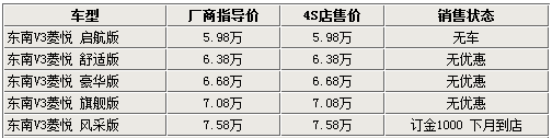 據(jù)東南經(jīng)銷商處銷售人員介紹,目前V3菱悅?cè)惮F(xiàn)車正在逐步充足貨源,最低配的車型仍因尚未投產(chǎn)而無法購買,請(qǐng)消費(fèi)者諒解。V3系列其它的幾款高配車型各店仍需要預(yù)訂,暫時(shí)無法滿足消費(fèi)者購車即提車的需要。同時(shí)銷售人員還說,現(xiàn)在購車沒有任何形式的現(xiàn)金優(yōu)惠,僅有精美的裝飾贈(zèng)送。而即將上市的V3菱悅風(fēng)采版則需在訂車后等待一個(gè)月的時(shí)間才可提車,訂金為1000元。