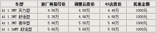 上個(gè)月中旬,奇瑞09款A(yù)1宣布在現(xiàn)有車型的基礎(chǔ)上增加了實(shí)力型和AMT兩種新車型,同時(shí)舒適型和豪華型官方降價(jià)4000元,售價(jià)已進(jìn)入五萬(wàn)元以內(nèi)。網(wǎng)站近日了解到,各家4S店內(nèi)的新車價(jià)格有所變化,全系車型均可小幅優(yōu)惠1000元。詳情如下: