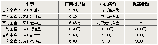 據(jù)北京地區(qū)吉利4S店銷售人員表示,吉利金鷹目前只有1.5L手動車型有現(xiàn)車銷售,自動版車型則沒有現(xiàn)車,并且不接受預(yù)訂,具體到店時間目前還不得而知。不過,現(xiàn)在購買吉利金鷹手動版車型,全系都可以優(yōu)惠3000元。