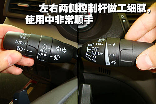 方向盤左右兩側(cè)控制桿為軟橡膠包裹手感細(xì)膩,無(wú)論是看、觸都能感覺(jué)到這部分材料的工藝質(zhì)量很好。并且旋鈕設(shè)計(jì)能夠滿足手指粗大駕駛者的使用及調(diào)節(jié)。