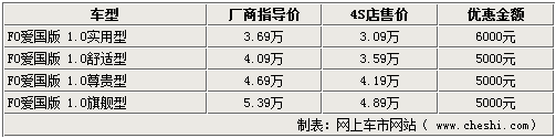 據(jù)比亞迪汽車4S店銷售人員介紹,比亞迪F0愛國版igo系列車型的現(xiàn)車并不是很齊全,實用型和舒適型都有現(xiàn)車,尊貴型和旗艦型則需要預訂,大概10-15天即可提車。而目前1.0L實用型和舒適型都有現(xiàn)車,其中實用型可以優(yōu)惠6000元,優(yōu)惠后售價已經(jīng)接近3萬;而其他車型只可以優(yōu)惠5000元現(xiàn)金。