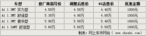 據(jù)奇瑞汽車4S店銷售人員介紹,奇瑞09款A(yù)1目前只有舒適型有現(xiàn)車銷售,原廠商指導(dǎo)價(jià)為5.38萬元,官方降價(jià)后為4.98萬元。A1 1.3L豪華型和新增加的實(shí)力型和自動(dòng)擋目前都沒有現(xiàn)車,預(yù)訂需要等1-2周才能提到現(xiàn)車。目前購(gòu)買奇瑞A1全系車型,都可以贈(zèng)送一款價(jià)值3000元的GPS導(dǎo)航儀一部。