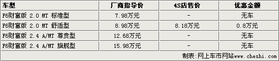 據(jù)比亞迪4S店銷售人員介紹,目前比亞迪F6只有2.0L手動舒適型有現(xiàn)車銷售,可以優(yōu)惠8000元現(xiàn)金,如果到店詳談還可以有更多的優(yōu)惠政策。而2.0L手動標準型因為配置較低,北京市場一直就沒有現(xiàn)車;2.4L車型也需要預(yù)定,交付訂金后需等半個月左右即可提車。