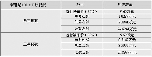 貸款詳解:新君越新上市不久,目前仍需要加價(jià)提車,現(xiàn)在實(shí)行的分期付款購(gòu)車,分為兩年及三年付款兩類,買車的朋友可以根據(jù)自己的實(shí)際能力選擇貸款項(xiàng)目。首付款為凈車價(jià)的三成,也就是在9.69萬(wàn),當(dāng)然編者所列的車型是新君越的最高配,按照比例來(lái)計(jì)算的話其它版本的車型首付款要低于9.69萬(wàn)。