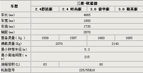 全新一代三菱歐藍德的身尺寸達到了4665mm;1800mm;1735mm,保證了其內部橫向空間及頭部空間的寬敞。2.67米的軸距為新歐藍德提供了舒適的內部空間。新歐藍德的最小離地間隙為215mm,足以適應一般道路的路況,同時5.3m的最小轉彎半徑,也可以適應中國地區(qū)道路窄小的特點。60升的油箱,可以保障人們日常出游的需要。