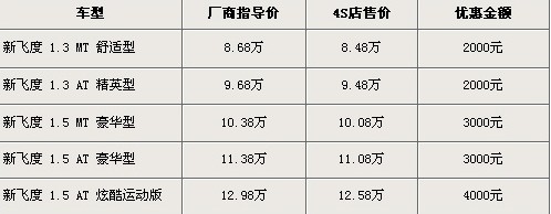 據(jù)廣州本田北京地區(qū)4S店銷售人員介紹,新飛度在售車型分為1.3L及1.5L共5個(gè)車型在售,最低售價(jià)8.48萬(wàn)元,全系車型優(yōu)惠金額2千-4千不等。目前新飛度銷售火爆,部分車型及顏色需要預(yù)定。北京地區(qū)各4S店由于訂單不同,各店銷售的現(xiàn)車顏色有所不同。