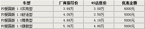 據(jù)比亞迪汽車4S店銷售人員介紹,比亞迪F0愛國版igo系列車型的現(xiàn)車并不是很齊全,實用型和舒適型都有現(xiàn)車,尊貴型和旗艦型則需要預訂,大概10-15天即可提車。而目前1.0L實用型和舒適型都有現(xiàn)車,其中實用型可以優(yōu)惠6000元,優(yōu)惠后售價已經接近3萬;而其他車型只可以優(yōu)惠5000元現(xiàn)金。