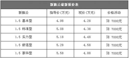 新旗云是目前國內(nèi)市場上最便宜的緊湊型新車,全系售價均在4-5萬元區(qū)間,性價比比夏利等競爭對手高出不少,非常值得入手。近日,編輯從北京地區(qū)的亞運村汽車交易市場奇瑞汽車綜合經(jīng)銷商處了解到,近期新旗云全系可優(yōu)惠7000元,和8月底9月初的價格持平,其中新旗云最低配車型的售價為4.28萬元,僅比夏利貴了5000元左右,性價比突出。以下是新旗云最新報價表: