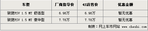 經(jīng)銷商透露,現(xiàn)在各店內(nèi)的FSV基本可滿足消費(fèi)者的購(gòu)車要求,車型及顏色也較為齊全,不再需要預(yù)訂購(gòu)買。問及車型的優(yōu)惠,銷售人員表示,由于駿捷FSV為剛剛上市的新車,所以店內(nèi)暫時(shí)沒有任何形式的優(yōu)惠,還請(qǐng)消費(fèi)者諒解。