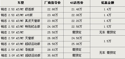 目前銳志全系車型最高優(yōu)惠可到1.6萬元。目前優(yōu)惠后的最低售價僅為21.48萬元,其中現(xiàn)車主要是2.5S版車型,2.5V部分車型需要預(yù)訂,訂金需要交納5000元。最快11月才能提車。