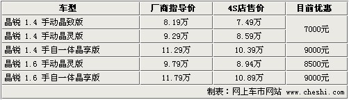 據(jù)4S店銷售人員介紹:目前晶銳全系最高優(yōu)惠達9000元,最低僅售7.49萬。晶銳目前各店內(nèi)現(xiàn)車較少,只有個別車型有現(xiàn)車,如需預(yù)定需等待1個半月時間。價格方面,如到店內(nèi)洽談可獲得更高優(yōu)惠。1.4升手動車型優(yōu)惠幅度,由原來的6000元增至7000元,而1.4升與1.6升自動擋車型已優(yōu)惠9000元,相比之前的6000元增幅達33.3%。