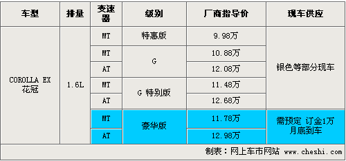 花冠EX系列兩款豪華版車型在增加了天窗的基礎上,還配置了真皮座椅、前閱讀燈等實用配置。價格放買你相比較G特別版漲了3000元。新增加的4款車型均為1.6小排量車型,消費者在購車同時可以享受購置稅優(yōu)惠活動,目前尚沒有現(xiàn)車到店,消費者購車的話需要交訂金1萬元,預計月底可以到車。