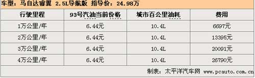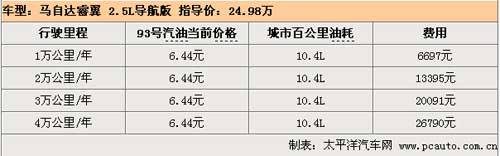 睿翼是我們對(duì)比的中高級(jí)車中油耗最低的一款車,城市百公里油耗僅為10.4L,對(duì)于一款2.5L排量的車型來說可謂十分出眾,而且馬自達(dá)廠商聲稱睿翼是可以使用93號(hào)汽油的而且不會(huì)對(duì)發(fā)動(dòng)機(jī)造成影響,93號(hào)汽油比97號(hào)油每升便宜了0.41元!所以總體來說,假如車主每年行駛3萬公里的話,一年下來對(duì)比燃油費(fèi)用最高的銳志可以節(jié)省近5000元。