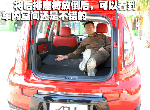 后排座椅可以全部放倒或是4/6比例分割放倒,這里面的空間足夠容納兩個(gè)人或是一臺(tái)大洗衣機(jī)或是電視了,買來SOUL用來搬家也許不是最好的主意,不過一旦有需求SOUL真的可以滿足儲(chǔ)物的需要了。后排座椅在乘坐三名乘員的時(shí)候顯得比較緊湊,畢竟這還只是一臺(tái)A0級(jí)的小車而已,所以對(duì)于空間我們也不應(yīng)有太多的奢求。
