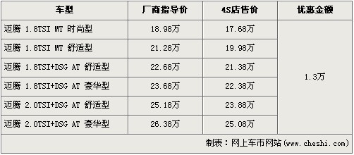 據(jù)北京一汽大眾經(jīng)銷店銷售人員介紹,邁騰全系車型全系優(yōu)惠1.3萬元。經(jīng)1.3萬元的優(yōu)惠后,全系入門級(jí)的1.8TSI MT時(shí)尚型的售價(jià)從18.98萬元下降到了17.68萬元。全系最高配的邁騰2.0TSI豪華版經(jīng)1.3萬元優(yōu)惠后,售價(jià)降到了25.08萬元。銷售人員還介紹,目前邁騰全系現(xiàn)車都比較充足。