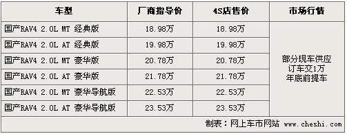據(jù)一汽豐田北京地區(qū)4S店銷售人員介紹,目前該車有部分車型少量現(xiàn)車,由于RAV4貨源比較緊張,大部分車型及顏色消需要提前預(yù)定,訂車需要等待2個(gè)月的時(shí)間,也就是要到年底前才可以提到現(xiàn)車。如果著急購買,需加價(jià)現(xiàn)金一萬元或在4S店購買等值的裝飾,F(xiàn)車顏色以黑色、白色、銀色為主。北京地區(qū)各4S店由于訂單不同,各店銷售的現(xiàn)車顏色有所不同。
