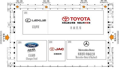 二層5號館內(nèi)豐田、雷克薩斯占據(jù)一半的面積,而另一半則被奔馳、江淮、福特所占據(jù),其中豐田新普銳斯、雷克薩斯GX460將發(fā)布,而奔馳則有新E200和E260發(fā)布,福特的?怂筍VP將正式上市。