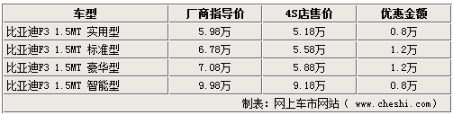作為比亞迪汽車旗下的重點(diǎn)產(chǎn)品,比亞迪F3在今年又推出了智能白金版,新款車型增加了無鑰匙系統(tǒng)、智能娛樂通訊系統(tǒng)等高端配置,使這款自主品牌家用轎車的競爭力更加突出。網(wǎng)上車市網(wǎng)站了解到,雖然比亞迪F3智能白金版上市時(shí)間不長,但目前優(yōu)惠幅度有所提升,經(jīng)銷商處全系最高可給出1.2萬的優(yōu)惠。詳情如下:
