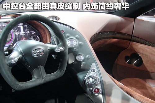 內(nèi)飾設(shè)計(jì)由英菲尼迪和奢侈品牌LV聯(lián)合完成,風(fēng)格抽象,采用顛覆傳統(tǒng)的不對稱式設(shè)計(jì),黑色駕駛席與紅色客席對比鮮明,中控臺完全集中在駕駛席一側(cè)。內(nèi)飾材質(zhì)以真皮和實(shí)木為主,并用大量鋁制配件點(diǎn)綴,突顯運(yùn)動氣質(zhì)。