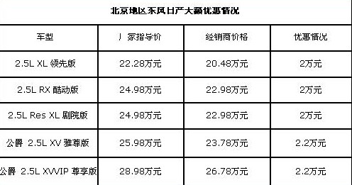 近日,筆者從東風(fēng)日產(chǎn)北京經(jīng)銷店了解到,新天籟2.5車型最高將優(yōu)惠2.2萬,并且4S店有現(xiàn)車,提車速度較快,這對(duì)那些準(zhǔn)備出手新天籟的北京朋友的確是一個(gè)好消息。