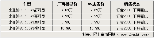 10月26日,比亞迪汽車首款中級車型G3正式在國內(nèi)上市,售價7.69-10.99萬元。比亞迪G3是比亞迪汽車A3銷售網(wǎng)絡(luò)和G系產(chǎn)品的首款車型,標志著比亞迪汽車開啟了全新的產(chǎn)品時代,走向高端化發(fā)展路線。網(wǎng)上車市網(wǎng)站了解到,目前比亞迪各家經(jīng)銷商處還沒有G3現(xiàn)車銷售,僅提供預(yù)訂,訂金2000元,最快將在下個月到店。詳情如下: