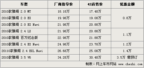 據(jù)廣州本田4S店銷售人員介紹,目前老款雅閣車型已停產(chǎn),銷售車型均為2010款。頂級(jí)車型購買可優(yōu)惠3萬元,2.0自動(dòng)檔標(biāo)配可優(yōu)惠8千元。現(xiàn)在店內(nèi)現(xiàn)車比較緊張,大部分車型顏色需要預(yù)訂,訂金為2000元。如消費(fèi)者有意購買,到店詳談會(huì)有更優(yōu)惠的價(jià)格。北京地區(qū)各4S店由于訂單不同,各店銷售的現(xiàn)車顏色有所不同。