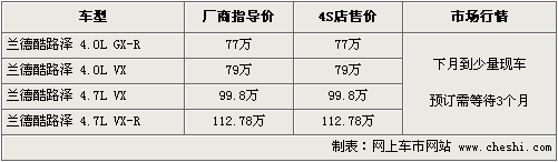 據(jù)4S店銷售人員介紹,蘭德酷路澤因價(jià)格較貴,均已訂單式銷售,所有車型需預(yù)訂,訂金為1萬元,需等待3個(gè)月左右時(shí)間。另據(jù)介紹,下月會(huì)有一臺(tái)白色頂配版現(xiàn)車到店。對此車感興趣的朋友可咨詢經(jīng)銷商處,北京地區(qū)各4S店由于訂單不同,各店銷售的現(xiàn)車顏色有所不同。