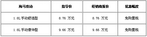 隨著年末的臨近,明年的購置稅新政成為城中話題。近日新政策公布,明年優(yōu)惠收縮至75折,讓不少觀望的朋友緊張起來。車天下編輯從昆明合達獲悉,為滿足消費者年底購車的迫切希望,現(xiàn)推出海馬歡動1.8L全系車型免購置稅活動。具體車型及詳細優(yōu)惠政策,如下表: