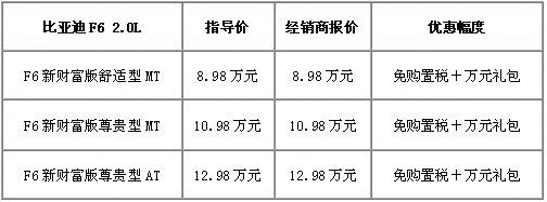 從10月昆明地區(qū)上牌量數(shù)據(jù)顯示,比亞迪F6高居中型車上牌量排行榜第三位,由此可以看出昆明消費者從比亞迪F6的熱衷。在目前一車難求的情況下,車天下編輯從昆明匯強最新獲悉,購比亞迪F6全系車型均可享受購置稅全免政策以及萬元隨車禮包贈送。具體車型及詳細優(yōu)惠政策,如下表: