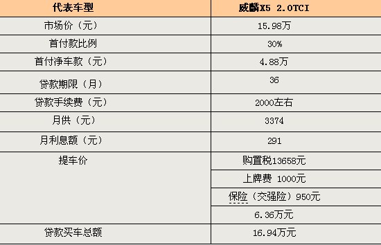 威麟X5將于新年第一天正式上市,目前這款車只有一個版本—威麟X5 2.0TCI。雖然這款車還未上市,但是已經(jīng)出現(xiàn)了貸款方案,方便了一些想通過貸款買車的朋友。威麟X5的市場指導價已經(jīng)曝光為15.98萬元,按照首付三成三年貸款的方案,首付凈車款只要4.88萬,三年下來貸款買車總額為16.94萬元。