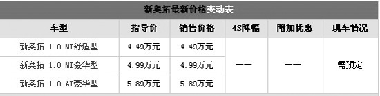 目前新奧拓有3款車型在售,其中手動(dòng)舒適型標(biāo)配ABS/EBD和前排雙安全氣囊安全裝置,同時(shí)配置后霧燈以及前門電動(dòng)車窗等配置;手動(dòng)豪華版在舒適型的基礎(chǔ)上增加了遙控鑰匙、鋁合金輪轂、真皮座椅、單碟CD、前霧燈以及后門車窗電動(dòng)調(diào)節(jié)等人性化配置;而自動(dòng)豪華版和手動(dòng)豪華版的配置相同。