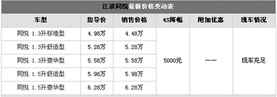 江淮同悅有1.3L和1.5L兩種排量,全為手動(dòng)檔車型。分標(biāo)準(zhǔn)型、舒適型和豪華型三種配置。標(biāo)準(zhǔn)型無(wú)安全氣囊,配備有ABS制動(dòng)防抱死系統(tǒng),四門車窗和電調(diào)后視鏡;舒適型增添了駕駛座安全氣囊、倒車?yán)走_(dá)、遙控鑰匙和中控;豪華型相對(duì)于舒適型升級(jí)了副駕安全氣囊和前霧燈安全配置,配備了單碟CD機(jī)并升級(jí)了音響系統(tǒng),增加了后視鏡加熱功能和鋁合金輪轂。