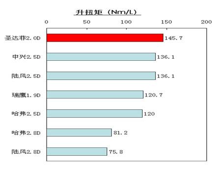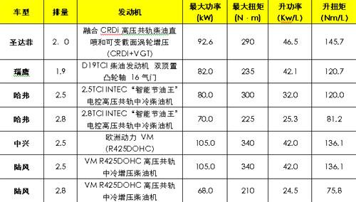 通過(guò)發(fā)動(dòng)機(jī)的對(duì)比(上表),我們不難發(fā)現(xiàn),在發(fā)動(dòng)機(jī)的功率和扭矩方面中興和陸風(fēng)略勝一籌,然而在真正反映發(fā)動(dòng)機(jī)動(dòng)力技術(shù)水平的指標(biāo)——升功率上,排量較小的圣達(dá)菲2.0T則領(lǐng)先排名第二的瑞鷹10.5。