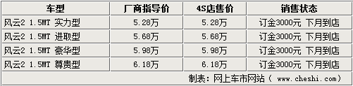 奇瑞經(jīng)銷商表示,現(xiàn)在店內(nèi)的風(fēng)云2新車不全,消費(fèi)者購(gòu)車需要繳納3000元訂金并等待半個(gè)月才可提車。由于是全新的車型,所以現(xiàn)階段購(gòu)車暫時(shí)沒(méi)有任何形式上的優(yōu)惠。