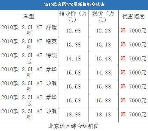 近日,編輯從北京地區(qū)綜合經(jīng)銷商處了解到,奔騰B70有黑色、銀色和灰色現(xiàn)車,基本上可以滿足消費(fèi)者的需求,如果購車需要預(yù)定,等待半個(gè)月左右就可以提車;目前購車全系有7000元的現(xiàn)金優(yōu)惠。據(jù)經(jīng)銷商透露,消費(fèi)者要想以這個(gè)價(jià)格提車,需要在店內(nèi)做一條龍服務(wù),其中車輛四項(xiàng)基本保險(xiǎn)可以打8.5折(約合4200-5500元左右)。以下是奔騰B70最新價(jià)格變化表: