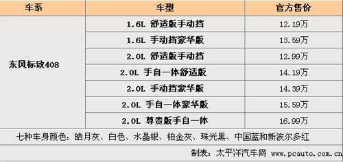 1月25日,東風(fēng)標(biāo)致408在北京全球首發(fā)上市,這是標(biāo)致汽車品牌創(chuàng)立120年以來,首次在海外市場全球首發(fā)其最新一代車型,同時公布了全系車型的售價。此次上市的東風(fēng)標(biāo)致408系列共有7款車型,分為舒適版、豪華版、尊貴版三種配置版本,以配備CVTS-II技術(shù)的2.0L發(fā)動機(jī)為主打產(chǎn)品,其價格從12.99萬元至16.99萬元;同時408系列中也包含1.6L發(fā)動機(jī)系列,其手動舒適版入門售價為12.19萬元,主打車型2.0L舒適版手自一體版售價為14.19萬元。7款車型的售價如下表:
