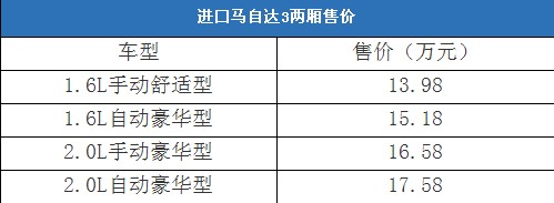 1月18日,進(jìn)口馬自達(dá)3兩廂在珠海正式上市,上市車型包括1.6L和2.0L兩個(gè)排量、共4款車型,具體包括1.6L手動(dòng)舒適型、1.6L自動(dòng)豪華型、2.0L手動(dòng)豪華型和2.0L自動(dòng)豪華型,售價(jià)13.98-17.58萬元,具體售價(jià)如下表: