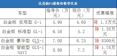 近日,編輯從北京地區(qū)綜合經(jīng)銷商處了解到,比亞迪F3近期現(xiàn)車比較充足,顏色也很齊全,可以滿足消費者的需要。目前購車最高有將近2萬元的現(xiàn)金優(yōu)惠幅度,性價比非常不錯。據(jù)經(jīng)銷商透露,消費者要想以這個價格提車,需要在店內(nèi)做購車一條龍,其中車輛四項基本保險可以打7.5折(約合2200-2800元左右)。以下是比亞迪F3最新價格變化表: