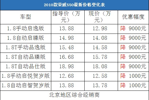 近日,編輯從北京地區(qū)綜合經(jīng)銷商處了解到,榮威550的現(xiàn)車充足,目前廠家推出了啟悅版和啟智版的賀歲版車型,除了賀歲版車型降價1000元外,其他車型均降價9000元。以下是榮威550最新價格變化表: