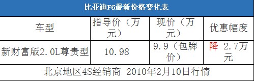 近日,編輯從北京地區(qū)比亞迪4S經(jīng)銷商處了解到,近期比亞迪F6有2.0L尊貴版現(xiàn)車(黑色、銀色)。目前這款車在店內(nèi)正在組織消費者團購活動,車輛全款(包括購車一條龍和購置稅、上牌)為9.9萬元,并且贈送價值1000元的汽車裝飾,相當(dāng)于優(yōu)惠了2.7萬元左右。以下是比亞迪F6最新價格變化表: