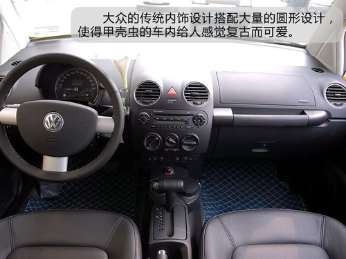 甲殼蟲的內(nèi)飾具有很明顯的大眾特征,各種開關、按鍵對于經(jīng)常駕駛大眾車輛的人來說是十分熟悉的。最特別的就是圓桶形的大儀表,速度表最大,幾乎占據(jù)了整個儀表盤面,中部是行車電腦,置于下方的是油表和轉(zhuǎn)速表。