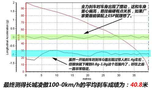 從剎車圖表上看,凌傲的初段剎車力度非常足,開始時(shí)最大的G值竟然超過了1.3G左右,但比較遺憾的是沒能保持下去,在整個(gè)剎車過程中出現(xiàn)了比較大的波動(dòng),不過好在之后的剎車G值也能保持在1G左右,另外較硬的懸掛以及緊湊的車身也對剎車成績有一定的幫助。