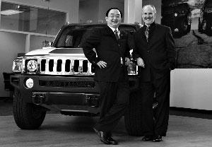 2009年10月8日,在美國(guó)密歇根州紹斯菲爾德,悍馬公司首席執(zhí)行官金泰勒(右)和四川騰中重工機(jī)械有限公司總經(jīng)理?xiàng)钜阍谝惠v悍馬汽車前合影。
