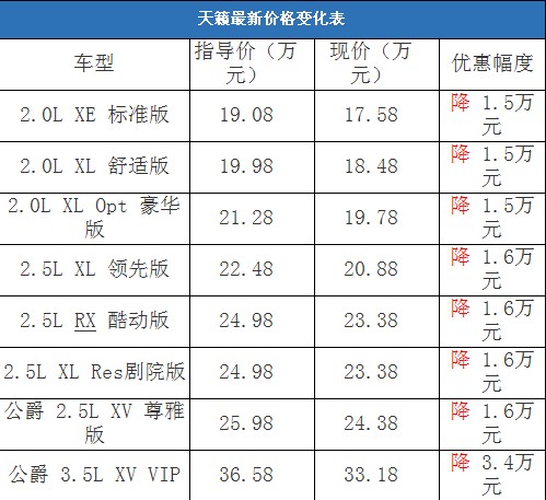 近日編輯從北京地區(qū)東風日產(chǎn)4S經(jīng)銷商處了解到,天籟有少量黑色現(xiàn)車,部分車型預定需要等待20天到一個月左右就可以提車。據(jù)經(jīng)銷商透露,目前2.0L排量車型可以優(yōu)惠1.5萬元,2.5L排量車型可以優(yōu)惠1.6萬元,而最高配天籟可以優(yōu)惠3.4萬元,可見天籟2.5L排量車型的優(yōu)惠幅度與1月份相比有了4000元左右的縮減。以下是新天籟最新價格變化表: