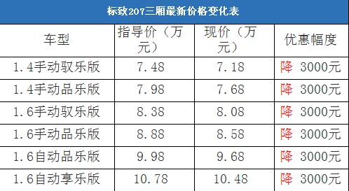近日,編輯從東風(fēng)標(biāo)致4S經(jīng)銷商處了解到,標(biāo)致207的現(xiàn)車充足,顏色也比較全,有紅、銀、灰、藍(lán)色現(xiàn)車。目前購買標(biāo)致207可以優(yōu)惠3000元現(xiàn)金,并且在此優(yōu)惠的基礎(chǔ)上還有價(jià)值3000元的導(dǎo)航、裝飾禮包贈(zèng)送。據(jù)經(jīng)銷商透露,贈(zèng)送的禮包可以折現(xiàn),但是需要消費(fèi)者到店與經(jīng)銷商詳談才可以確定。以下是標(biāo)致207最新價(jià)格變化表: