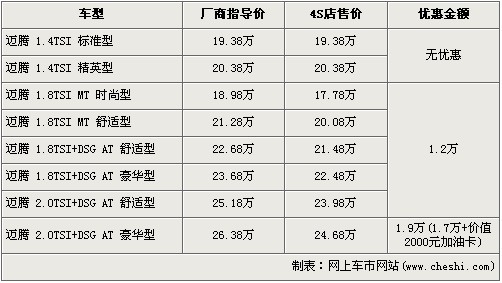 據(jù)北京一汽大眾經(jīng)銷店銷售人員介紹,邁騰全系最高配的2.0TSI自動豪華版灰色車型近期出現(xiàn)了總價值1.9萬元的優(yōu)惠,其中包括了1.7萬元的現(xiàn)金優(yōu)惠,并且贈送價值2000元的加油卡。銷售人員還介紹,邁騰新上市的1.4TSI車型停止了前段時間的加價,店內(nèi)有現(xiàn)車,1.8TSI車型優(yōu)惠1.2萬元。