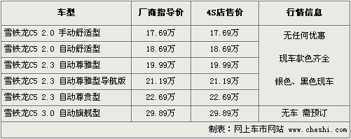 筆者從東風雪鐵龍經銷商處了解到,目前C5全系有舒適版、尊雅版以及尊貴版現車供應,主要有銀色、黑色、藍色外觀可選,顏色不齊全,其他款需要預定,訂金為2000元-5000元。同時4S店提供2.3排量試駕車供消費者體驗。目前全系車型尚沒有出現優(yōu)惠幅度。